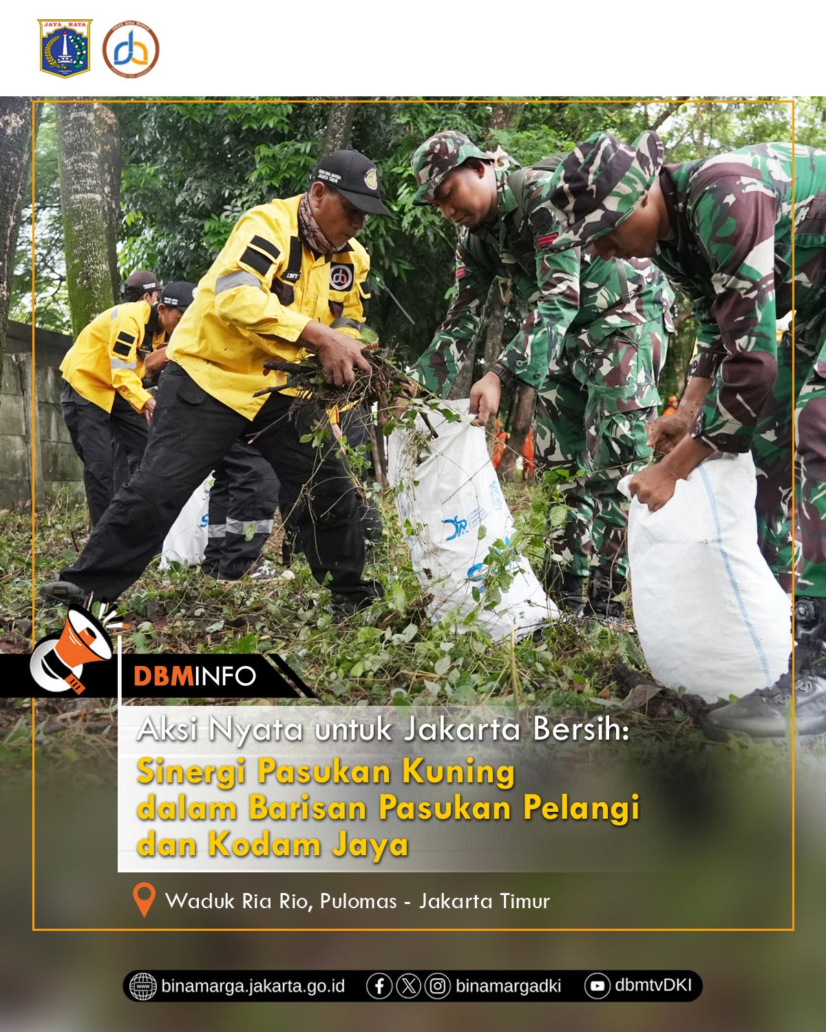Jakarta Timur — Komitmen menjaga kebersihan dan kelestarian lingkungan terus diwujudkan melalui kolaborasi lintas instansi. Pasukan Kuning Dinas Bina Marga Provinsi DKI Jakarta bersama Pasukan Pelangi dan Kodam Jaya melaksanakan kegiatan pembersihan lingkungan di kawasan Waduk Ria Rio, Pulomas, Jakarta Timur, Jumat (13/12).