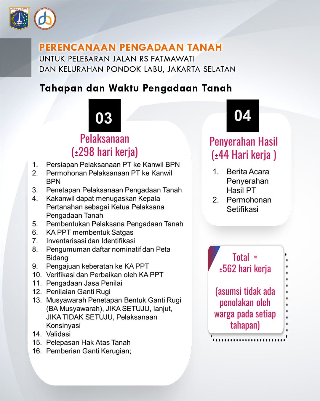 Langkah ini dilakukan sebagai tahap awal program pelebaran dan penataan jalan di Jl. RS Fatmawati sesuai amanah Rencana Tata Ruang Wilayah Provinsi DKI Jakarta yang merupakan bagian dari kawasan Transit Oriented Development (TOD) Fatmawati.