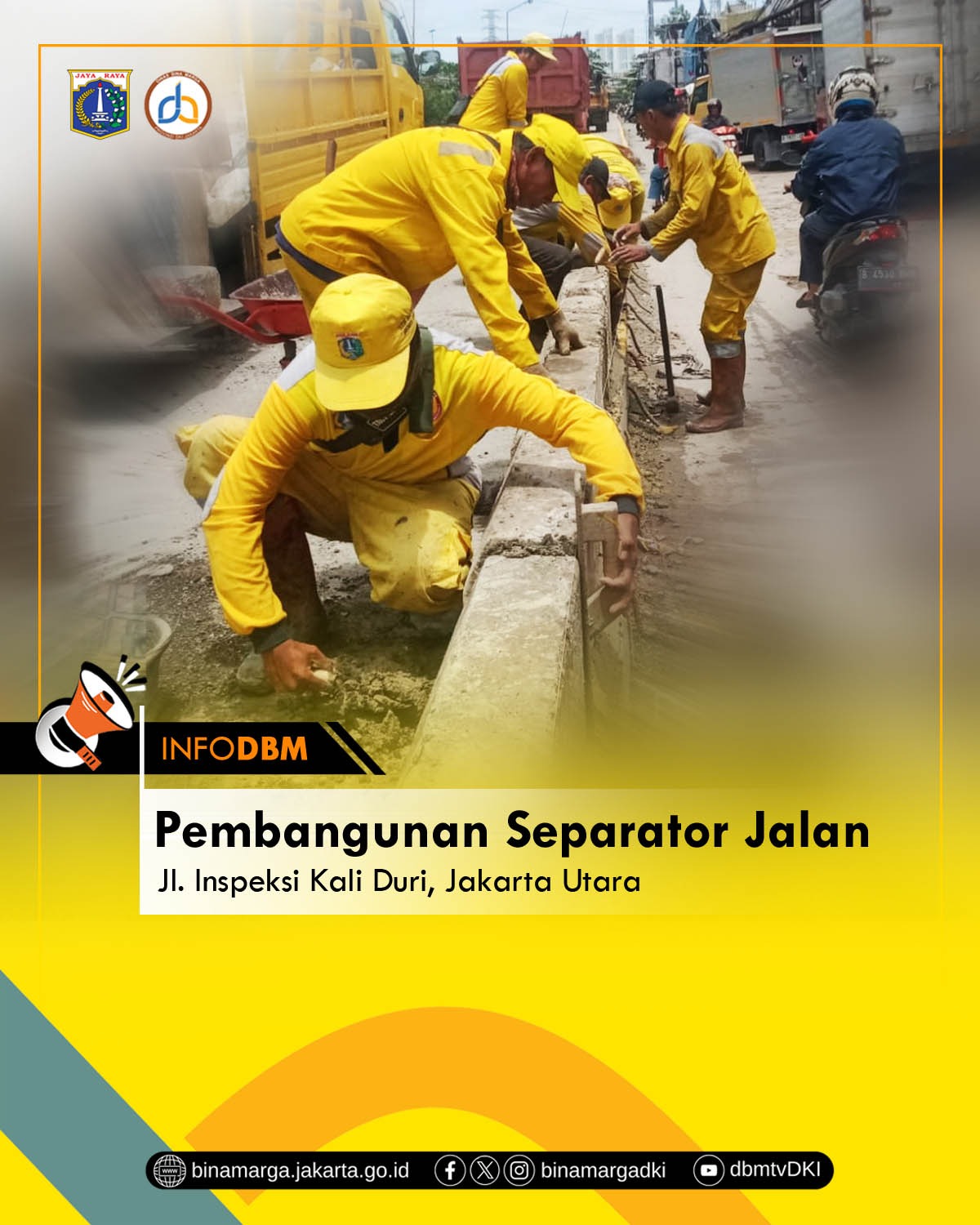 Jakarta — Dinas Bina Marga Provinsi DKI Jakarta melalui Pasukan Kuning Satuan Pelaksana (Satpel) Bina Marga Kecamatan Penjaringan, Jakarta Utara, telah menyelesaikan kegiatan pengecatan dan pembangunan separator jalan sepanjang 320 meter di Jalan Inspeksi Kali Duri, Kelurahan Pejagalan.