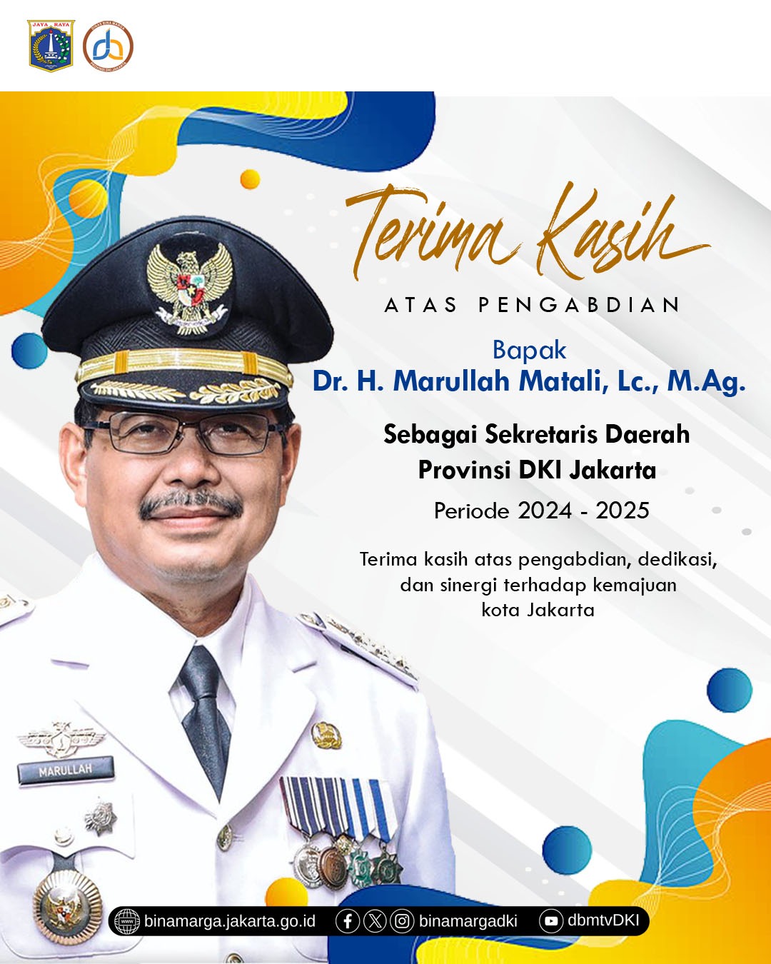 Terima kasih kepada Bapak Dr. H. Marullah Matali, Lc., M.Ag., atas dedikasi, komitmen, dan pengabdian beliau bagi kemajuan Jakarta selama menjabat sebagai Sekretaris Daerah Provinsi DKI Jakarta periode 2024–2025.